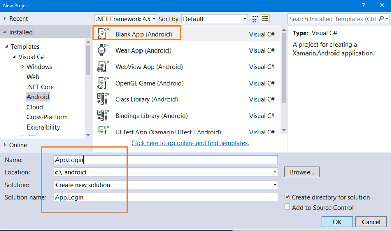 Selecione a linguagem Visual C# e o template Android -> Blank App (Android);