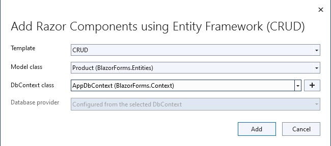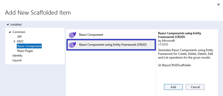 A seguir selecione : Razor Components using Entity Framework (CRUD) e clique no botão Add;