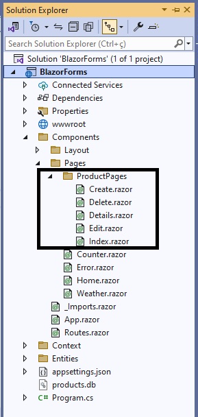 Ao final do processo serão criados os componentes Razor dentro da pasta Pages em uma pasta ProductPages: