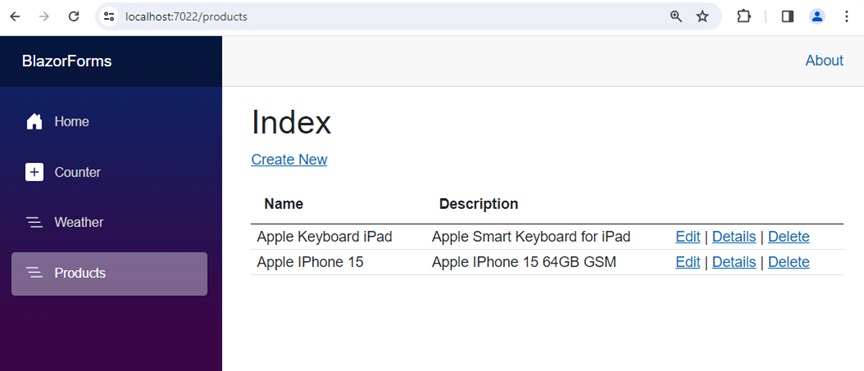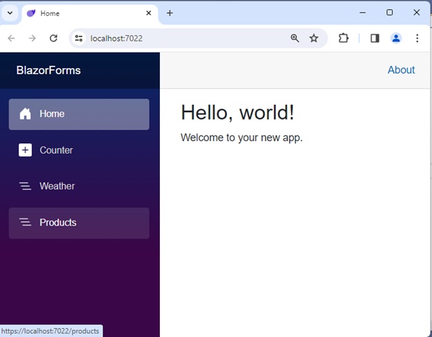 ... <div class="nav-item px-3"> <NavLink class="nav-link" href="products"> <span class="bi bi-list-nested-nav-menu" aria-hidden="true"></span> Products </NavLink> </div> ... |