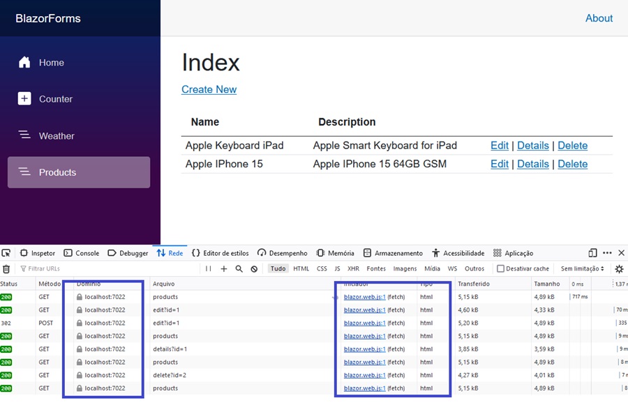 Para visalizar os requests fetchs emitidos pelo script blazor.web.js pressione F12 e na janela do console selecione Rede ou Network e após realizar as operações CRUD teremos o resultado abaixo: