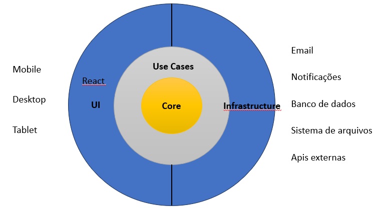 dependências fluem para dentro em direção ao Application Core. O Core não