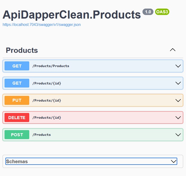 Executando o projeto teremos na interface do Swagger a exibição dos endpoints criados para realizar o CRUD de Produtos usando o Dapper: