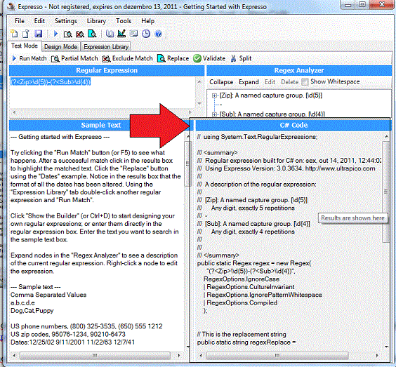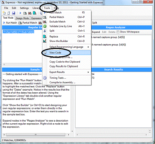 Após você testar e validar a sua expressão regular na opção Tool -> View Code você pode gerar o código escolhendo a sua linguagem preferida: