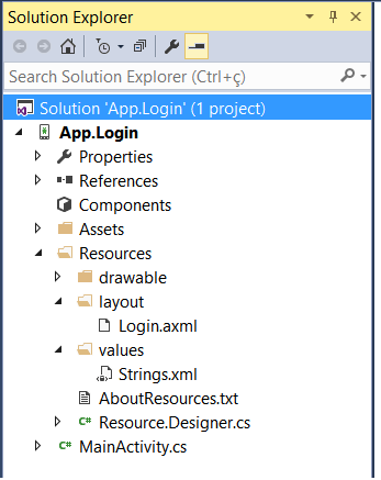 A seguir localize o arquivo Main.axml na pasta Resources\layout e altere o seu nome para Login.axml.