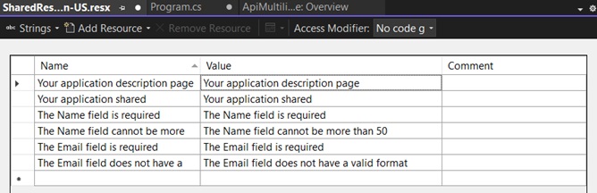 | [ApiController] [Route("api/[controller]")] public class HomeController : ControllerBase { private readonly IStringLocalizer public HomeController(IStringLocalizer { _sharedLocalizer = sharedLocalizer; } [HttpGet] public IActionResult Get() { return Ok(_sharedLocalizer["Your application shared resources."].Value); } |