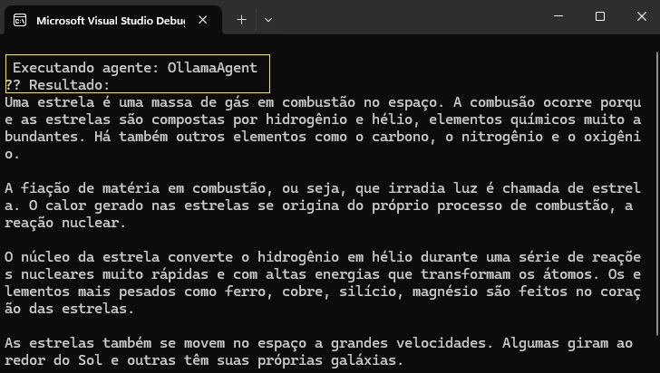 | using AgentesOllama; var thread = new AgentThread(); thread.AddStep(new AgentCall { Agent = new OllamaAgent(), Input = "O que é uma estrela ?" }); await thread.ExecuteAsync(); Console.ReadLine(); |