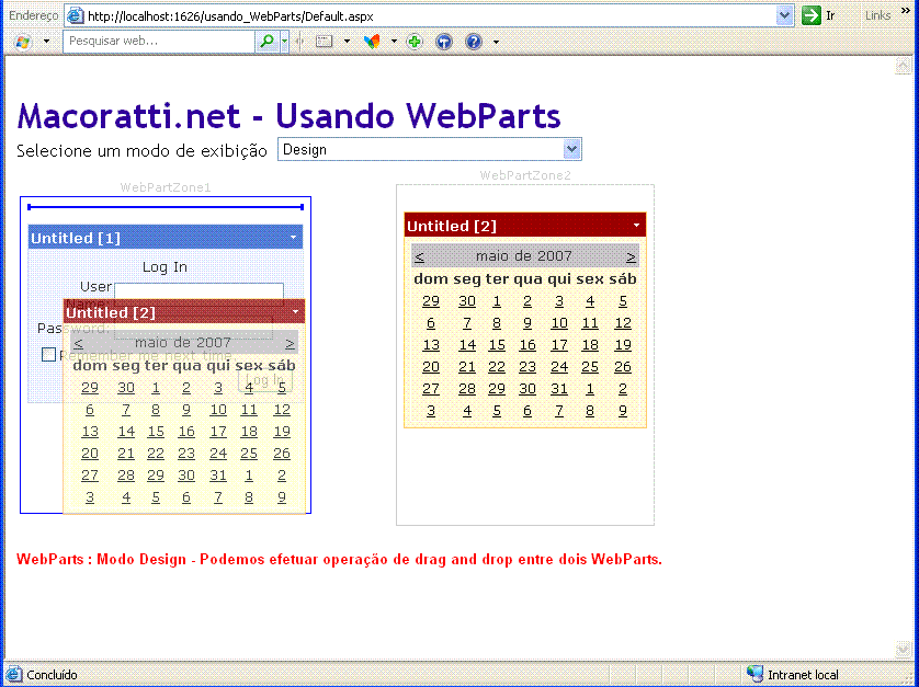 Alterando para o modo Design podemos arrastar os controles entre os WebPartZones da página. Vamos inverter a posição dos controles Login e Calendar arrastando e soltando cada um deles no WebPartZone diferente da localização atual.