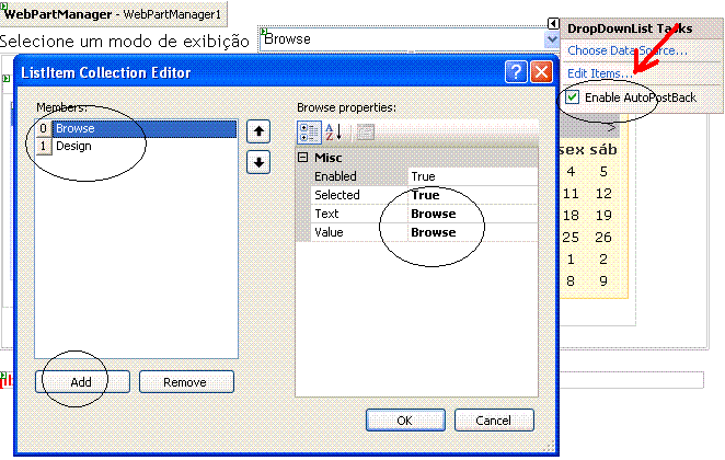 No componente dropdowlist marque a opção Enable AutoPostBack e clique em Edit Items. A seguir inclua dois itens no controle: Browse e Design. Vamos mostrar como trabalhar com WebParts no modo padrão ou Browse e no modo Design que permite o drag and drop.