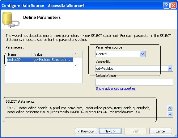 A seguir clique no botão OK e no botão Next> . Agora você vai definir o parâmetro para o código do pedido (pedidoID) que vai ser usada nesta consulta: