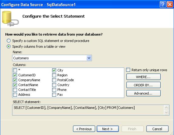 No assistente marque a opção DataBase e selecione o banco de dados Northwind.mdf , e , seguindo o assistente salve a conexão no arquivo web config e selecione a tabela Customers com os campos marcados conforme figura abaixo: