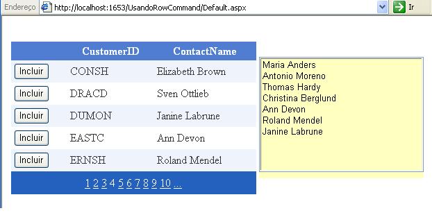 No exemplo a seguir é demonstrado como usar o evento RowCommand para incluir o nome de um cliente a partir de um GridView em um controle ListBox quando o botão Incluir for clicado;