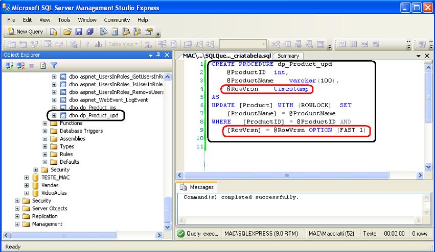 Este procedimento armazenado atualiza a tabela Product e usa a rowversion.