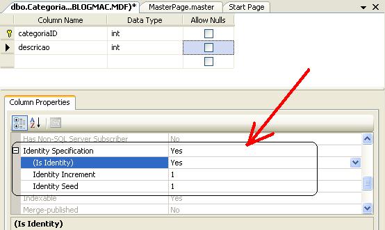 Nesta tabela e em todas as outras vamos definir o campo chave primária como sendo do tipo Identity , desta forma o campo será de numeração automática. |