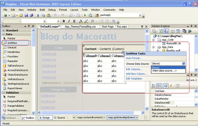 Agora a partir da ToolBox inclua um componente GridView e em GridView Tasks , opção Choose Data Source , selecione <New data source...>