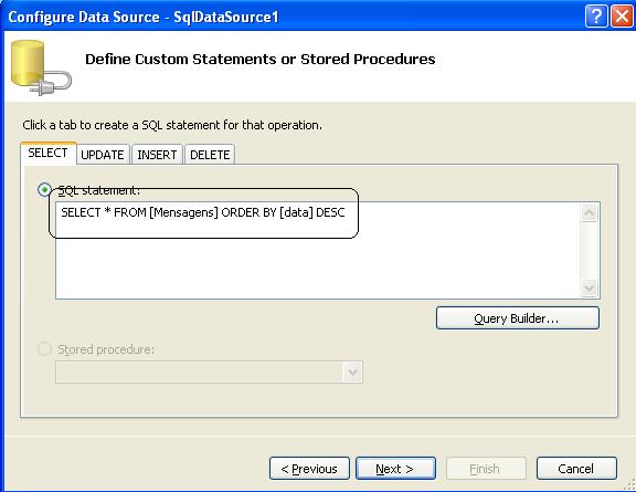 Agora vamos incluir um novo componente SqlDataSource (SqlDataSource2) na página e configurar uma nova fonte de dados usando o assistente. A string de conexão será a mesma que já foi definida BlogConnectionString; clique em Next> e marcando a opção : Specify a custom SQL statement or stored Procedure clique em Next>