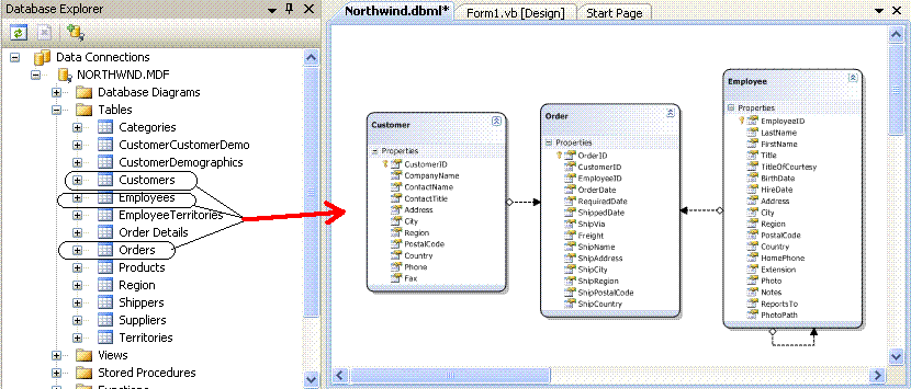 Você verá no descritor LINQ as classes das entidades: Customer, Order e Employee geradas e se clicar no arquivo Northwind.designer.vb verá o código gerado pelo mesmo.