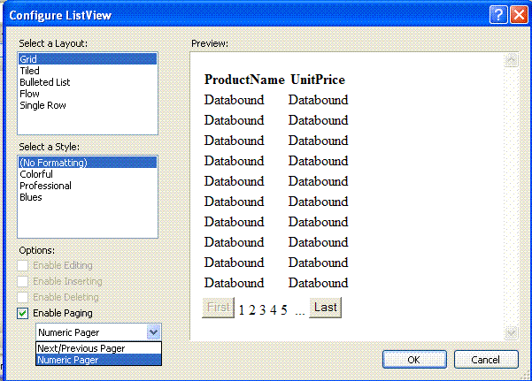 Vamos alterar a configuração do ListView apenas para mostrar outra opção. Desta vez selecione o leiaute Grid , o estilo ColorFul e marcando Enable Paging selecione a primeira opção disponível: