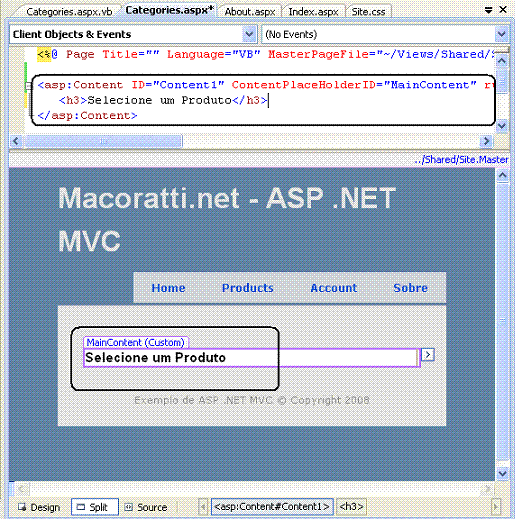 No nosso exemplo , que esta baseado no artigo do Scott, eu vou procurar criar uma visão (view) bem simples (mais simples que o exemplo do Scott) seguindo esta lógica eu vou usar a Master Page Site.Master que foi criada na pasta Shared pelo framework. Irei apenas incluir um menu com as opções : Home , Products, Account e Sobre.