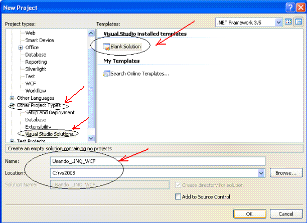 Na janela New Project selecione : Other Project Types e a seguir Visual Studio Solutions e em Templates selecione Blank Solution e informe o nome Usando_LINQ_WCF e escolha a localização do projeto;