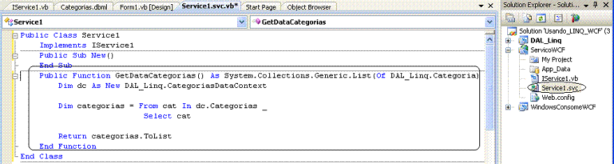 Abra o arquivo de interface IService1.vb e remova todo o código existente. A seguir inclua o código que define o método GetDataCategorias() que retorna uma Lista de Categorias do tipo DAL_Linq.Categoria;