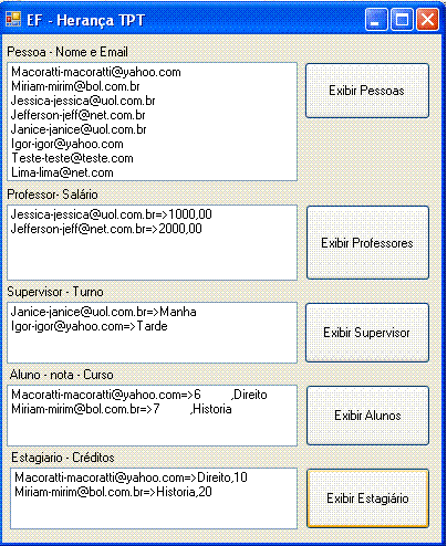 Vamos agora exibir a entidade Professor. Para acessar as propriedades herdadas das entidades derivadas incluímos o código a seguir no evento Click do botão : Exibir Professores: