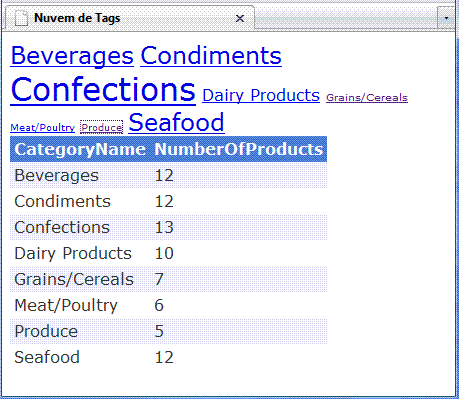 Neste exemplo vamos trabalhar com as tabelas Categories e Products do banco de dados Northwind.mdf onde iremos agrupar as categorias por número de produtos. Iremos exibir os nomes das categorias como itens da nuvem de tags e quanto mais produtos uma categoria tiver maior deverá ser o tamanho da fonte.