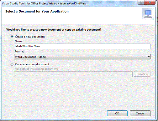 Abra o Visual Studio 2010 e no menu File->New Project, selecione o template Office -> 2007 -> Word 2007 Document e informe o nome tabelaWordGridView e clique no botão OK;