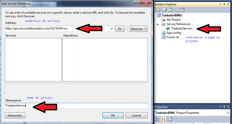 Em seguida informe o endereço do serviço: http://api.microsofttranslator.com/V1/SOAP.svc e informe o Namespace : TradutorService e clique em OK;