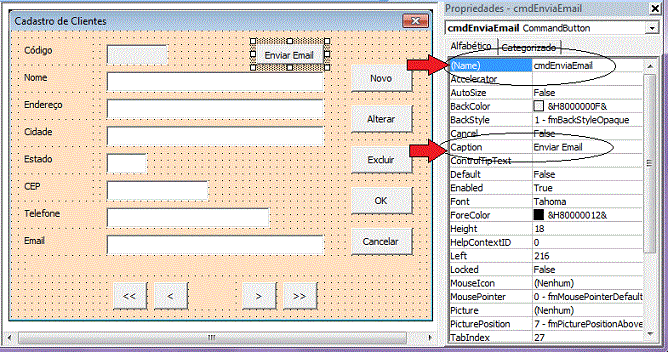 Para atribuir um nome e o texto a ser exibido no controle, quando pertinente, selecione o controle e pressione F4 para abrir a janela de propriedades;