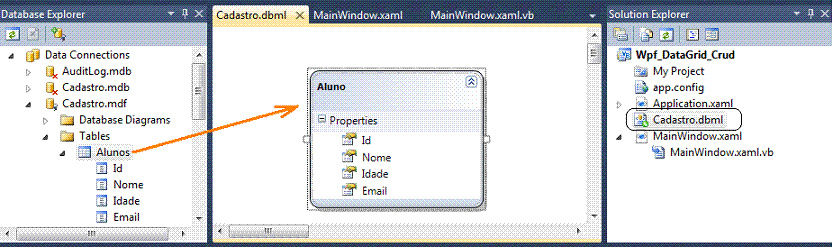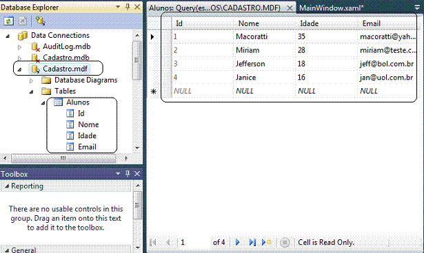 Como fonte de dados eu estou usando um banco de dados SQL Server criado no SQL Server Management Studio (veja referências) com o nome Cadastro.mdf e a tabela Alunos que possui os campos: Id, Nome , Idade e Email: