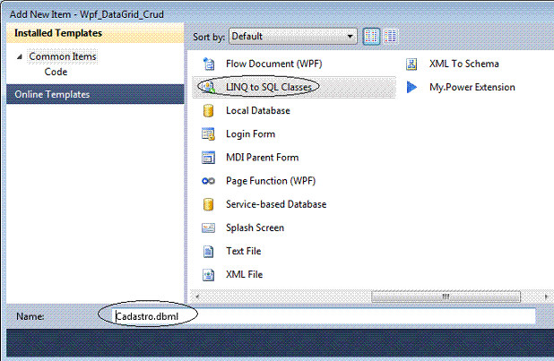 Agora vamos incluir a partir do menu Project->Add New Item , a partir da janela Templates, o item LINQ to SQL Classes alterando o nome para Cadastro.dbml e clicando no botão Add;