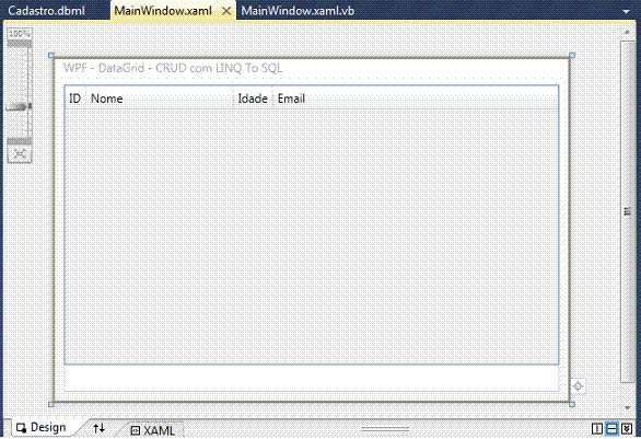 Vamos agora criar no arquivo MainWindow.xaml a interface da nossa aplicação que irá exibir os dados da tabela Alunos. Para isso vou usar um controle DataGrid definido conforme o leiaute da figura abaixo: