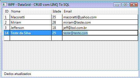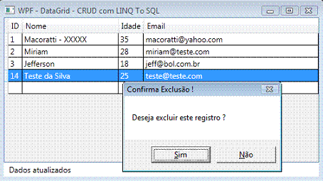 Assim pudemos conferir a utilização do LINQ to SQL em uma aplicação WPF para realizar as operações CRUD em um banco de dados SQL Server. O Entity Framework seria uma escolha mais adequada pelos recursos disponíveis e por poder ser usado com qualquer banco de dados.