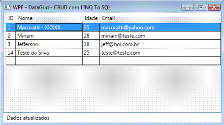 Se você executar o código agora (não esqueça de definir os eventos : dgData_PreviewExecuted e dgData_RowEditEnding) deverá obter o seguinte resultado:
