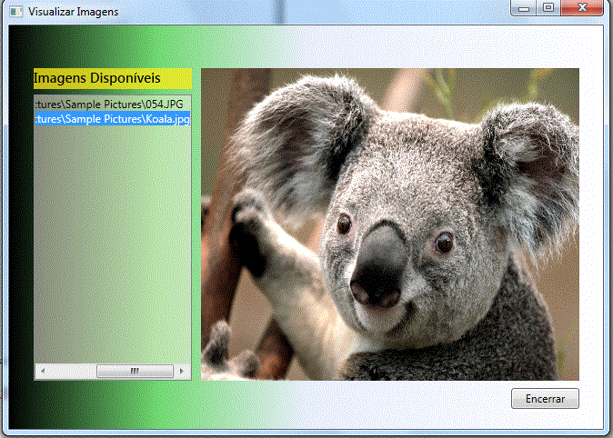 Selecionando uma imagem do controle ListBox a mesma será exibida no controle PictureBox da janela Window1.xaml: