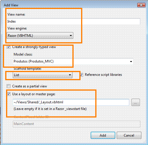 O ultimo passo é criar a View para exibir os dados. Para isso clique com o botão direito do mouse sobre o código da ActionResult Index e na janela Add View defina os valores conforme a figura abaixo: