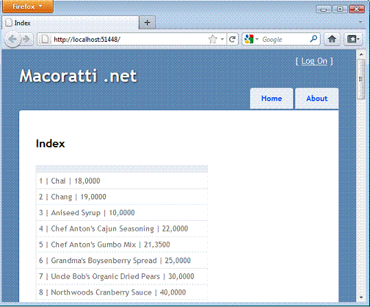Bem, vou aproveitar a estrutura criada e alterar esse comportamento modificando o método Index() do controlador e a View Index.vbhtml e, o mais importante definindo um Model de forma que eu possa acessar os dados da tabela Products do banco de dados Northwtind.mdf.