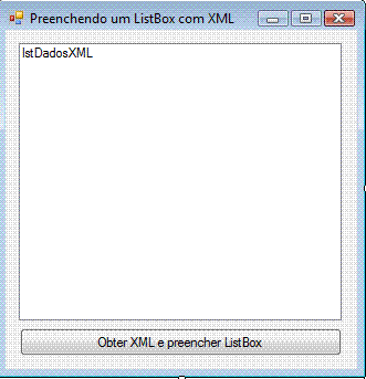 Altere o nome do formulário form1.cs para frmListBox.cs e inclua no formulário, a partir da ToolBox, um controle ListBox (name=lstDadosXML) e um controle Button (name= btnPreencherListBox) conforme o leiaute da figura 1.0 abaixo: