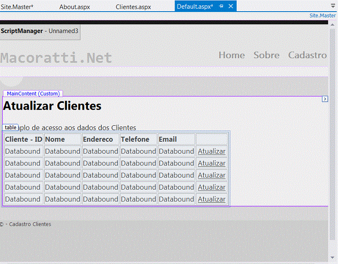 Dessa forma ao iniciarmos a aplicação iremos obter a exibição dos clientes no controle Repeater e do hyperlink -Atualizar - que quando clicando chama a página AtualizaCliente.aspx e passa o ID do cliente selecionado: