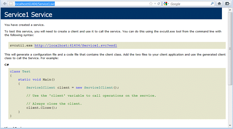 Copie a URL : http://localhost:61404/Service1.svc (no seu exemplo provavelmente a porta será diferente) para usá-la mais adiante.