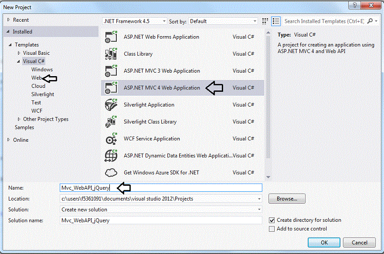 Selecione o template Visual C# -> Web -> ASP .NET MVC 4 Web Application e informe o nome Mvc_WebAPI_jQuery;