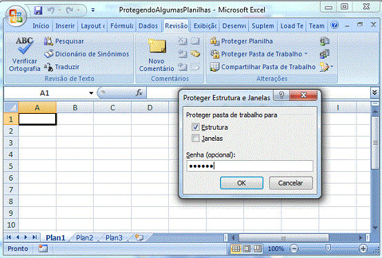 3- Deixe marcada apenas a opção Estrutura (A opção Janelas impede os usuários de alterar o tamanho ou posição de janelas de planilhas)