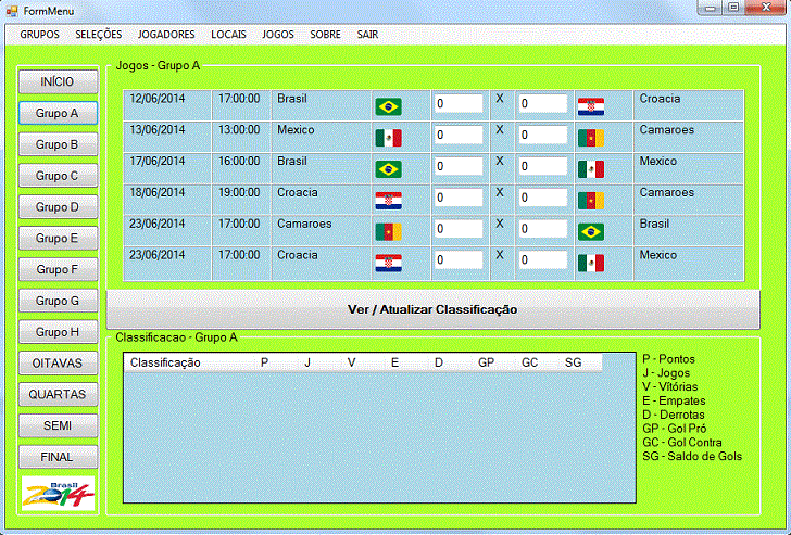 O formulário que exibe os jogos de cada grupo e a classificação permitindo ao usuário informar um placar e fazer simulações para classificação.