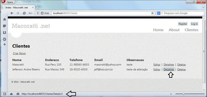 Clicando no link Clientes iremos visualizar a página Index da pasta Cliente exibindo todos os clientes cadastrados: