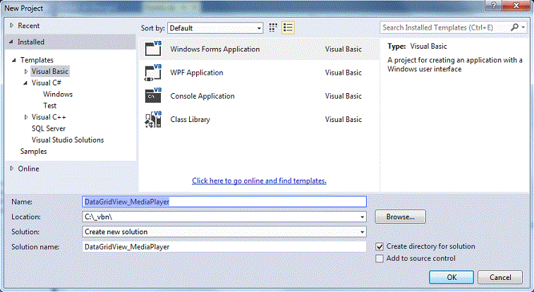 Selecione a linguagem VB .NET e o template Windows Forms e informe o nome DataGridView_MediaPlayer;