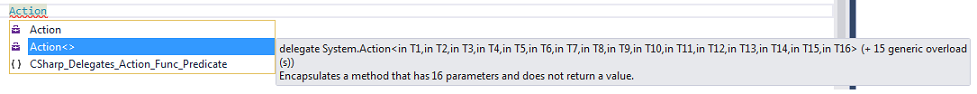 Sua assinatura possui 17 sobrecargas: Action, Action<T>, Action<T1,T2>, .....Action<T1,.....,T16>