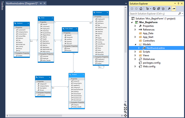 Clicando no botão Finish o modelo de entidades será gerado sendo identificado pelo contexto NorthwindEntities, sendo visualizado ao clicar no arquivo Northwind.edmx na pasta Models: