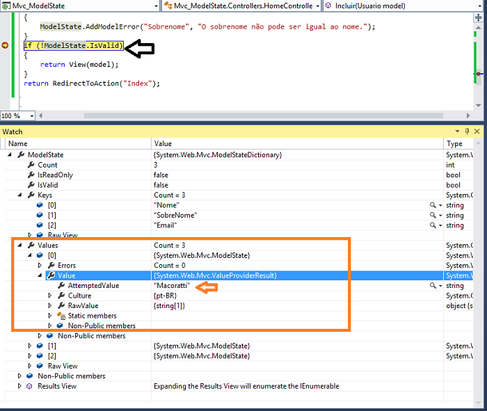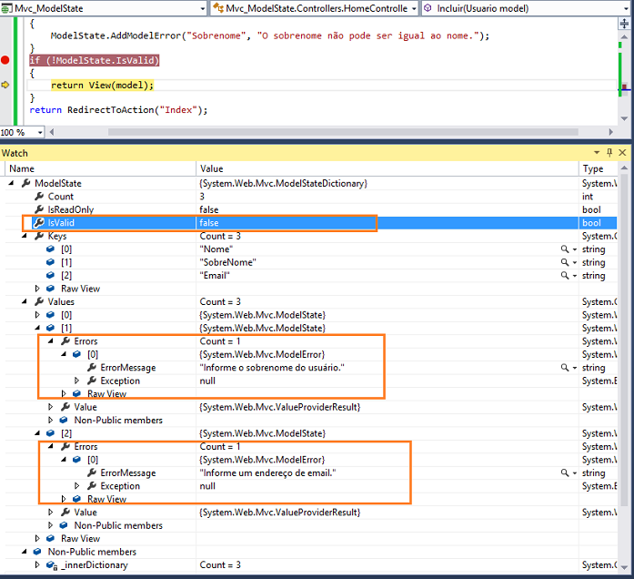 Expandindo para visualizar o conteúdo do ModelState atual obtemos:
