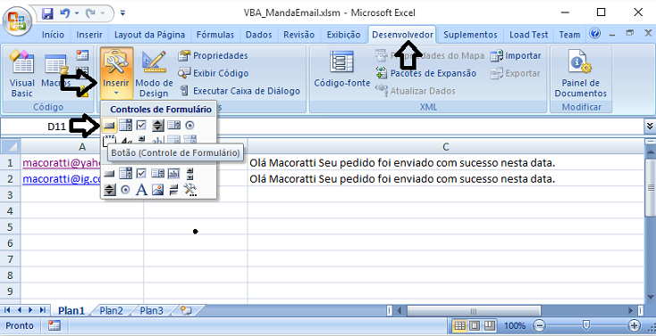 Pronto ! agora podemos abrir a planilha Excel e clicar no botão Enviar Emails para enviar os emails.